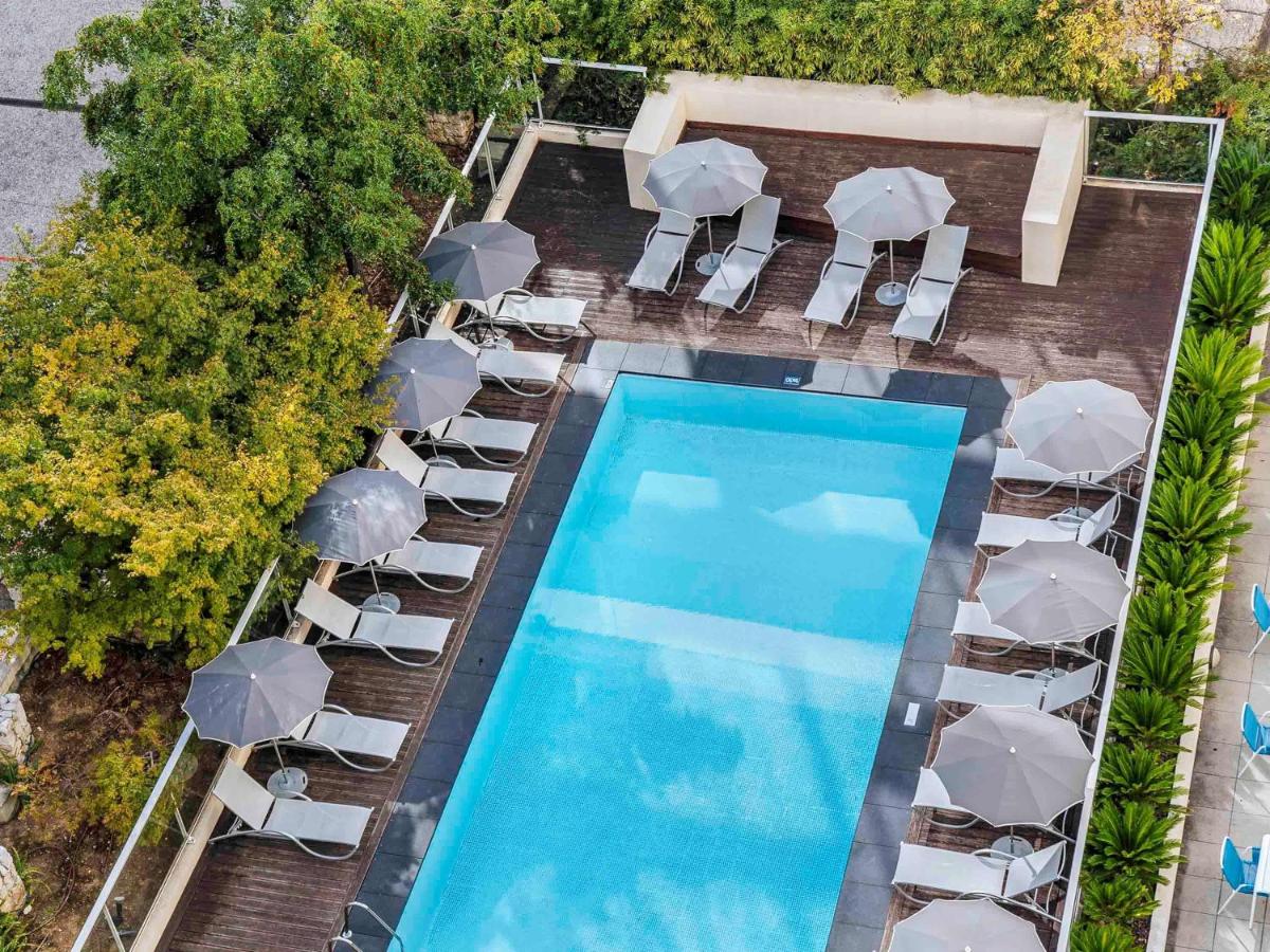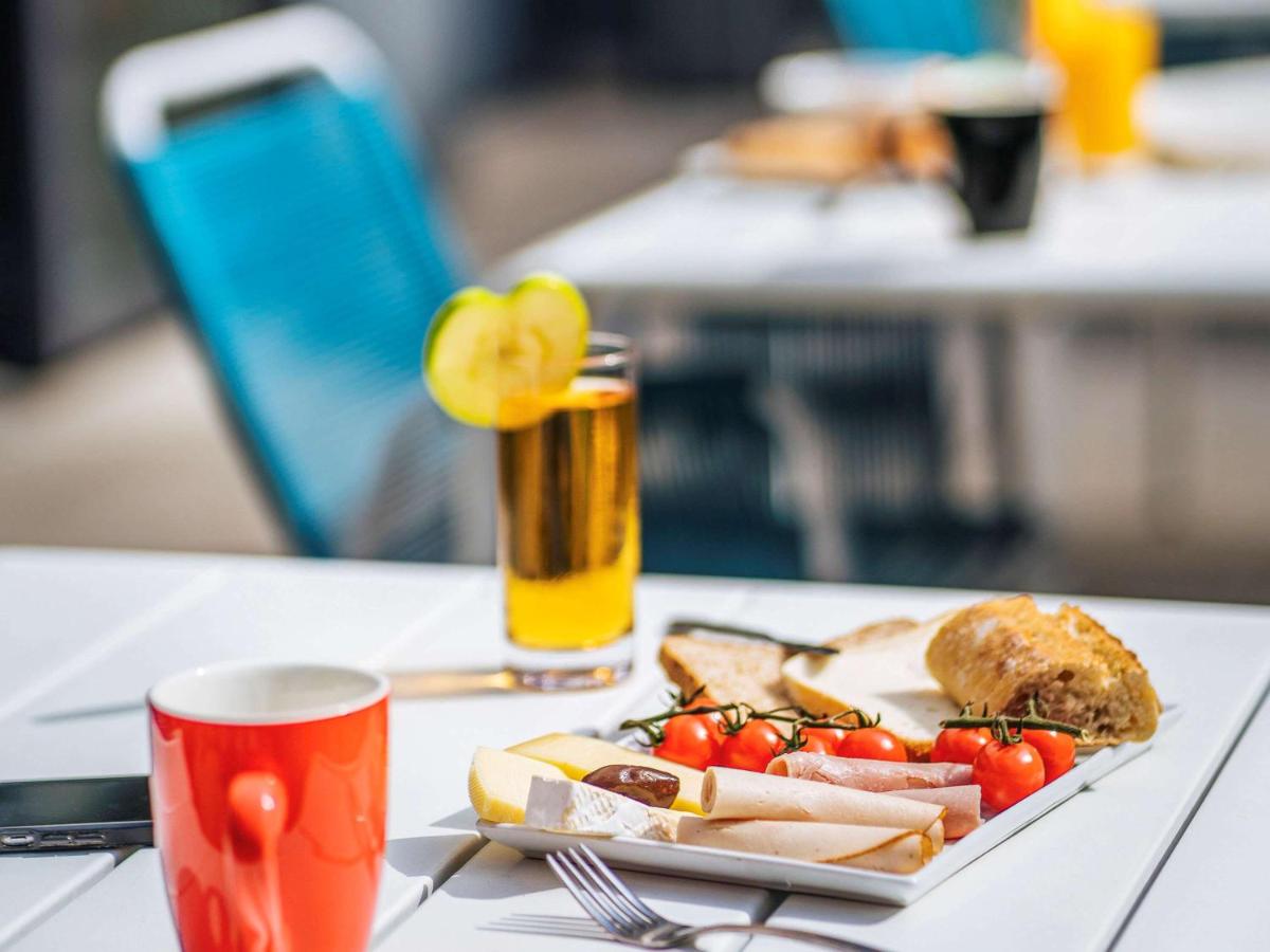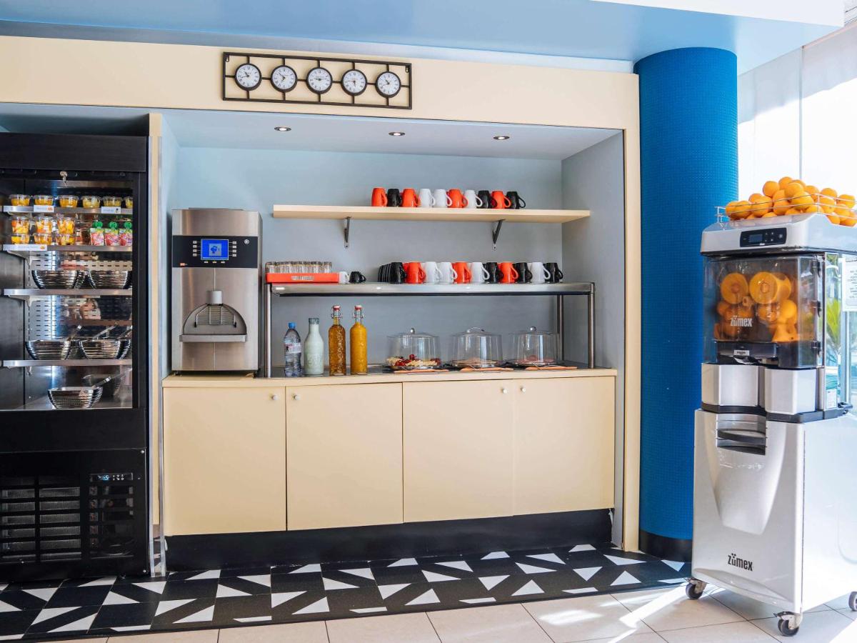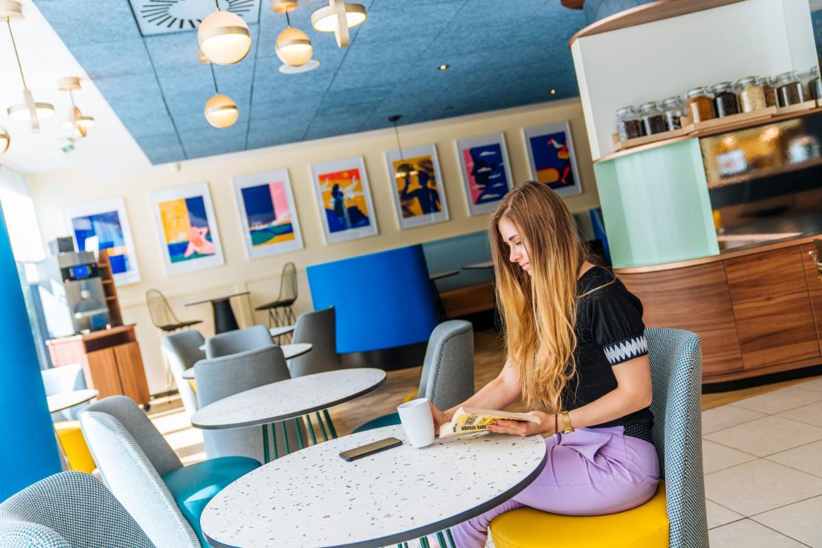 The gallery reveals the ibis Styles aesthetic—pops of color in bedding and walls, minimalist furnishings, and clean lines. Rooms show cheerful décor and functional layouts, while the breakfast room is open and bright, filled with natural light. The outdoor pool terrace stands out, a rare feature for an airport hotel, offering a sunny corner for relaxation. The bar and lounge areas are equally casual, with seating designed for comfort while waiting for flights or transport.