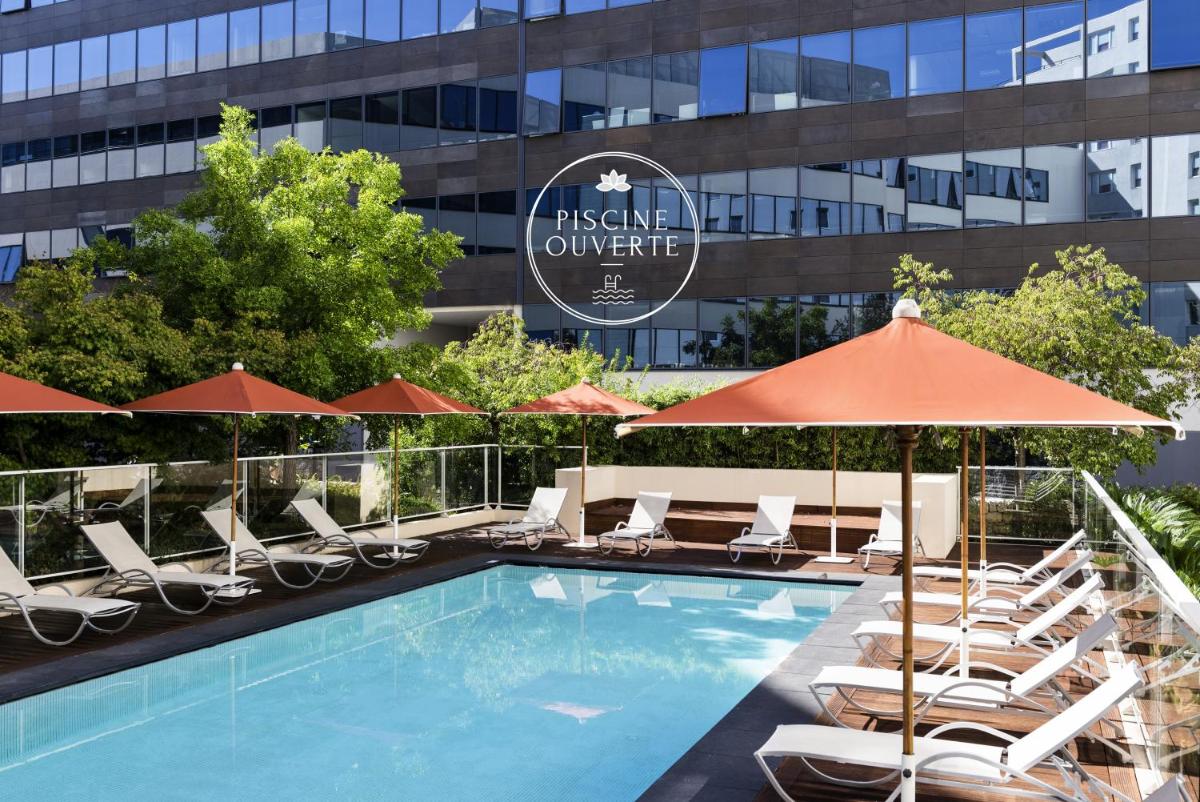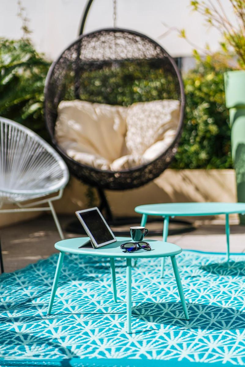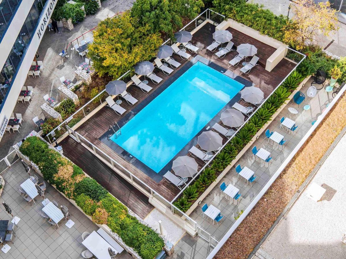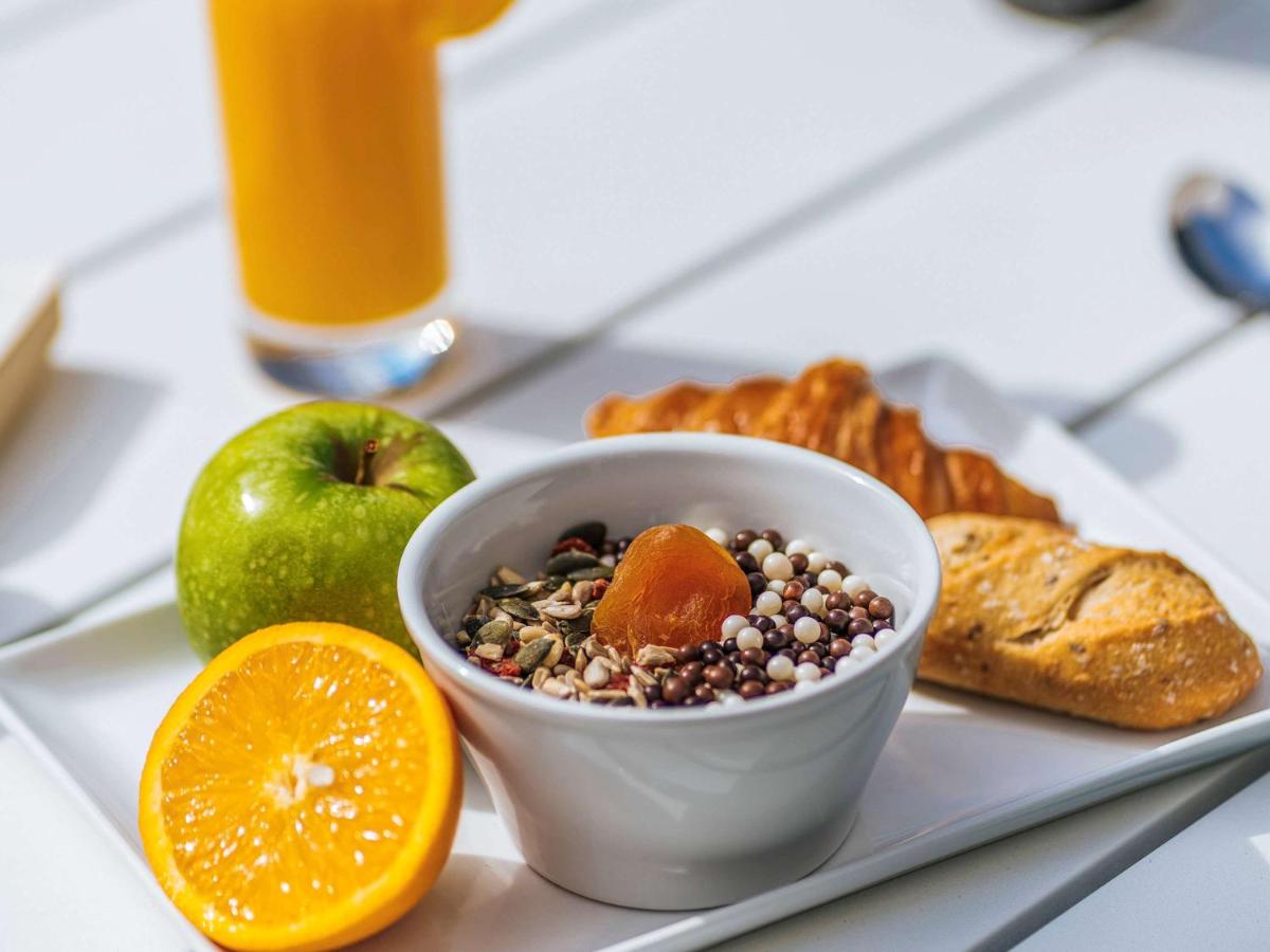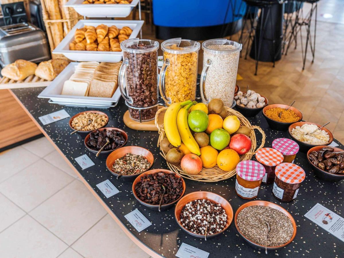 The gallery reveals the ibis Styles aesthetic—pops of color in bedding and walls, minimalist furnishings, and clean lines. Rooms show cheerful décor and functional layouts, while the breakfast room is open and bright, filled with natural light. The outdoor pool terrace stands out, a rare feature for an airport hotel, offering a sunny corner for relaxation. The bar and lounge areas are equally casual, with seating designed for comfort while waiting for flights or transport.
